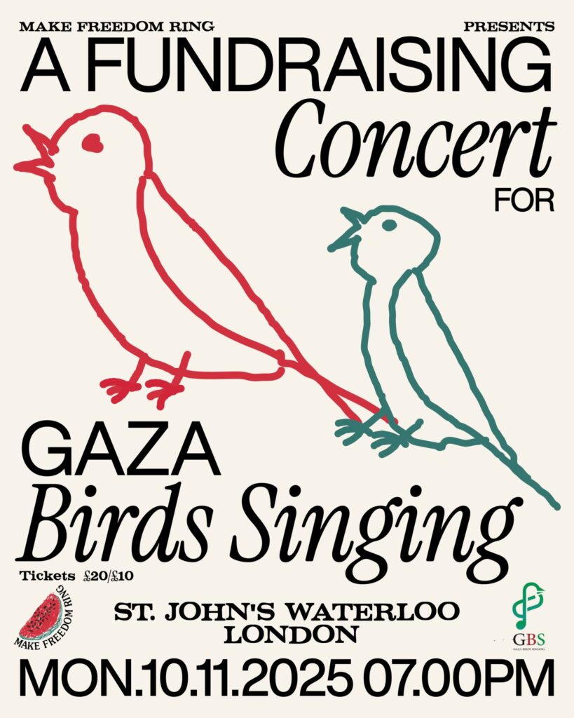 Make Freedom Ring returns to London with a concert raising funds for Gaza Birds Singing. Gaza Birds Singing are a Gaza-based music group that has been bringing together music teachers and displaced children throughout the war.